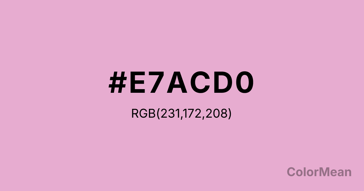 #E7ACD0 RGB value is (231, 172, 208). The hex color red value is 231, green is 172, and blue is 208. Its HSL format shows a hue of 323°, saturation of 55 percent, and lightness of 79 percent. The CMYK process values are 0 percent, 26 percent, 10 percent, 9 percent.