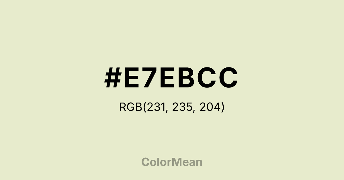 #E7EBCC RGB value is (231, 235, 204). The hex color red value is 231, green is 235, and blue is 204. Its HSL format shows a hue of 68°, saturation of 44 percent, and lightness of 86 percent. The CMYK process values are 2 percent, 0 percent, 13 percent, 8 percent.