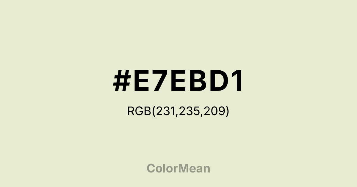 #E7EBD1 RGB value is (231, 235, 209). The hex color red value is 231, green is 235, and blue is 209. Its HSL format shows a hue of 69°, saturation of 39 percent, and lightness of 87 percent. The CMYK process values are 2 percent, 0 percent, 11 percent, 8 percent.