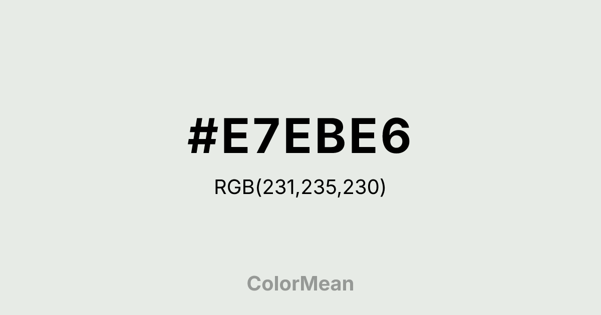 #E7EBE6 RGB value is (231, 235, 230). The hex color red value is 231, green is 235, and blue is 230. Its HSL format shows a hue of 108°, saturation of 11 percent, and lightness of 91 percent. The CMYK process values are 2 percent, 0 percent, 2 percent, 8 percent.