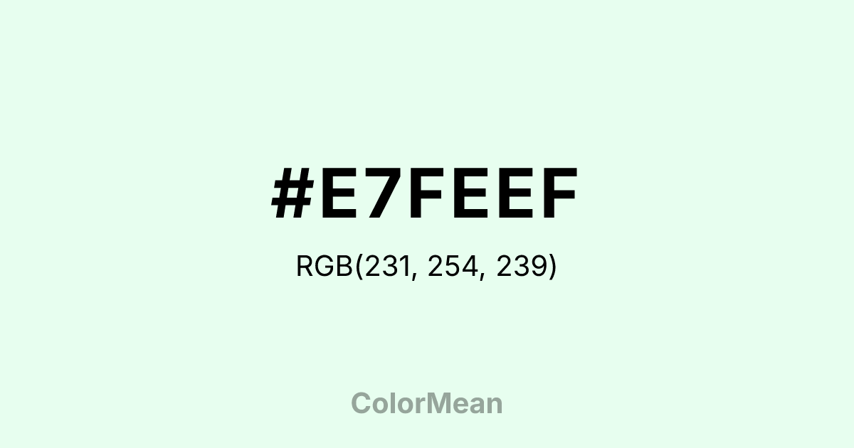 #E7FEEF RGB value is (231, 254, 239). The hex color red value is 231, green is 254, and blue is 239. Its HSL format shows a hue of 141°, saturation of 92 percent, and lightness of 95 percent. The CMYK process values are 9 percent, 0 percent, 6 percent, 0 percent.