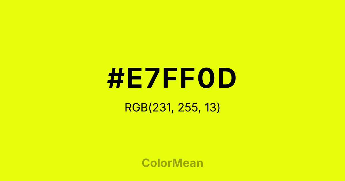 #E7FF0D RGB value is (231, 255, 13). The hex color red value is 231, green is 255, and blue is 13. Its HSL format shows a hue of 66°, saturation of 100 percent, and lightness of 53 percent. The CMYK process values are 9 percent, 0 percent, 95 percent, 0 percent.