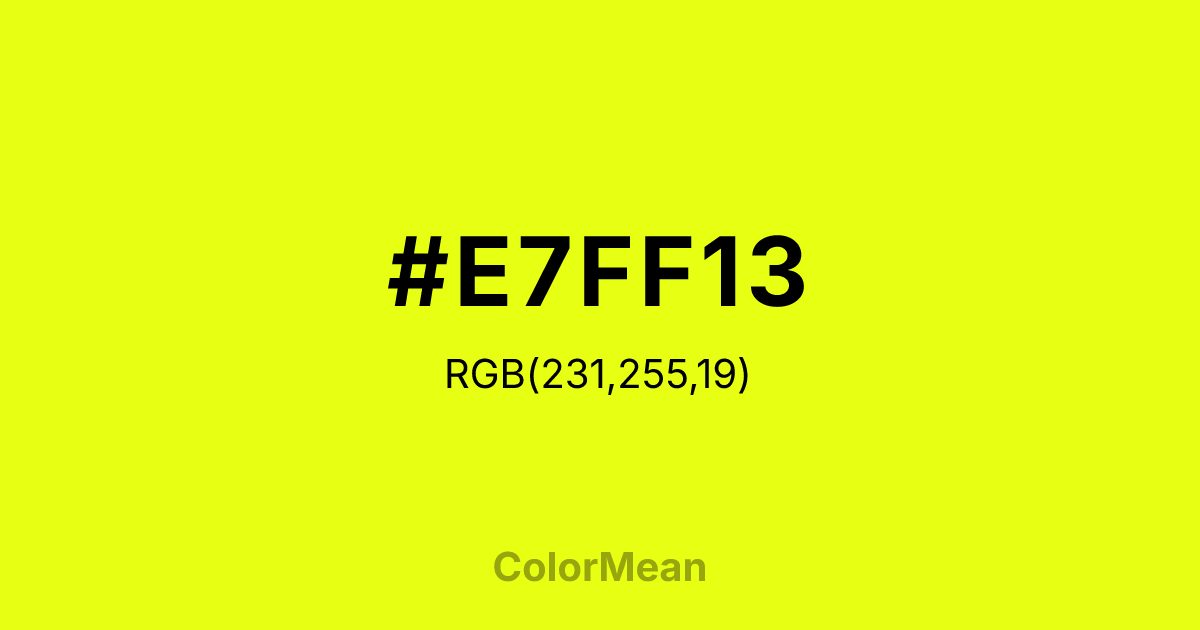 #E7FF13 RGB value is (231, 255, 19). The hex color red value is 231, green is 255, and blue is 19. Its HSL format shows a hue of 66°, saturation of 100 percent, and lightness of 54 percent. The CMYK process values are 9 percent, 0 percent, 93 percent, 0 percent.