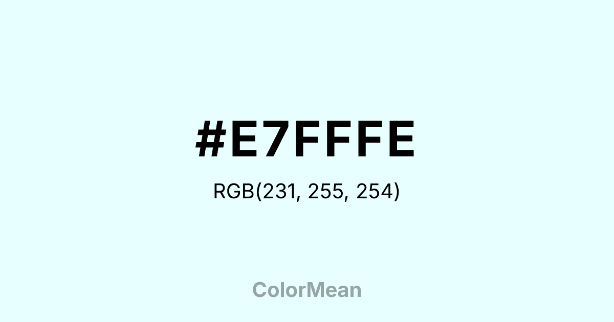 #E7FFFE RGB value is (231, 255, 254). The hex color red value is 231, green is 255, and blue is 254. Its HSL format shows a hue of 178°, saturation of 100 percent, and lightness of 95 percent. The CMYK process values are 9 percent, 0 percent, 0 percent, 0 percent.