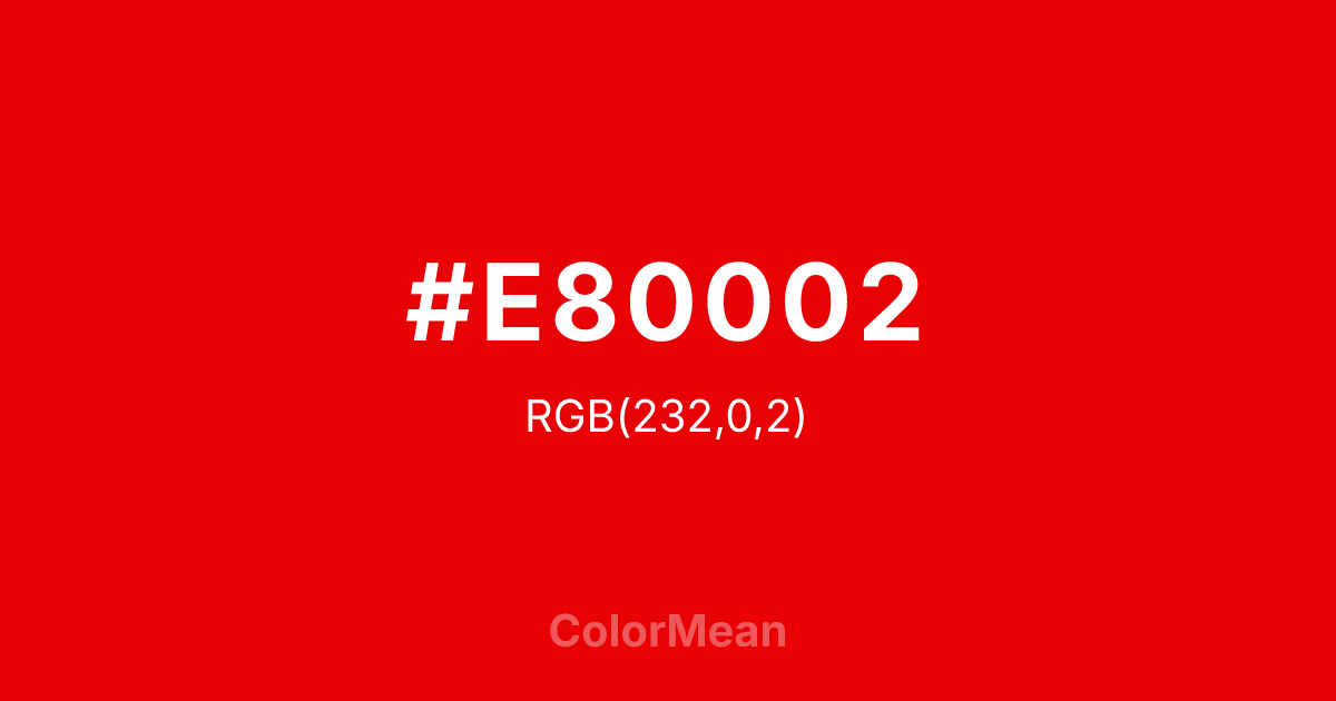 #E80002 RGB value is (232, 0, 2). The hex color red value is 232, green is 0, and blue is 2. Its HSL format shows a hue of 359°, saturation of 100 percent, and lightness of 45 percent. The CMYK process values are 0 percent, 100 percent, 99 percent, 9 percent.