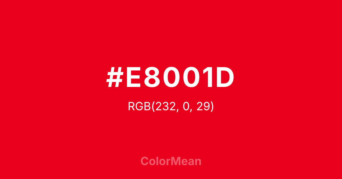 #E8001D RGB value is (232, 0, 29). The hex color red value is 232, green is 0, and blue is 29. Its HSL format shows a hue of 353°, saturation of 100 percent, and lightness of 45 percent. The CMYK process values are 0 percent, 100 percent, 88 percent, 9 percent.