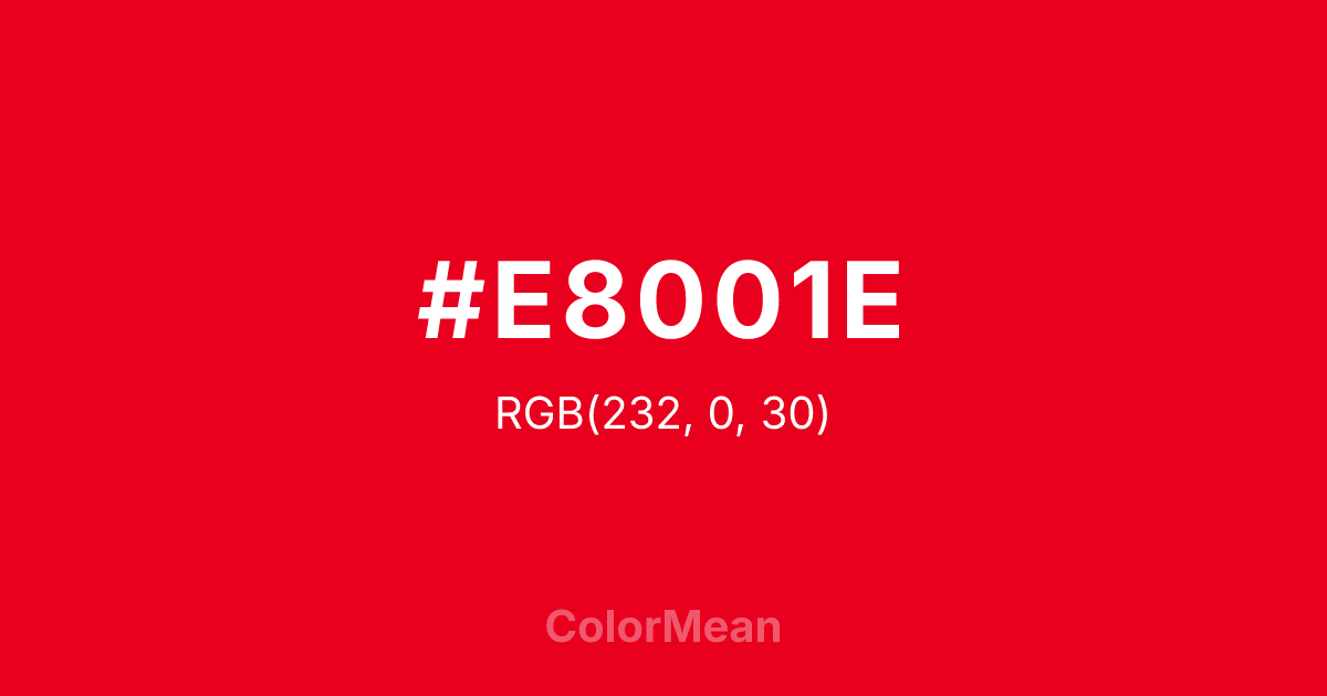 #E8001E RGB value is (232, 0, 30). The hex color red value is 232, green is 0, and blue is 30. Its HSL format shows a hue of 352°, saturation of 100 percent, and lightness of 45 percent. The CMYK process values are 0 percent, 100 percent, 87 percent, 9 percent.