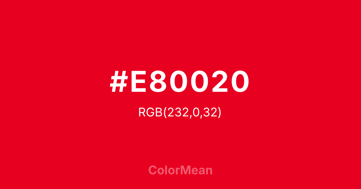#E80020 RGB value is (232, 0, 32). The hex color red value is 232, green is 0, and blue is 32. Its HSL format shows a hue of 352°, saturation of 100 percent, and lightness of 45 percent. The CMYK process values are 0 percent, 100 percent, 86 percent, 9 percent.