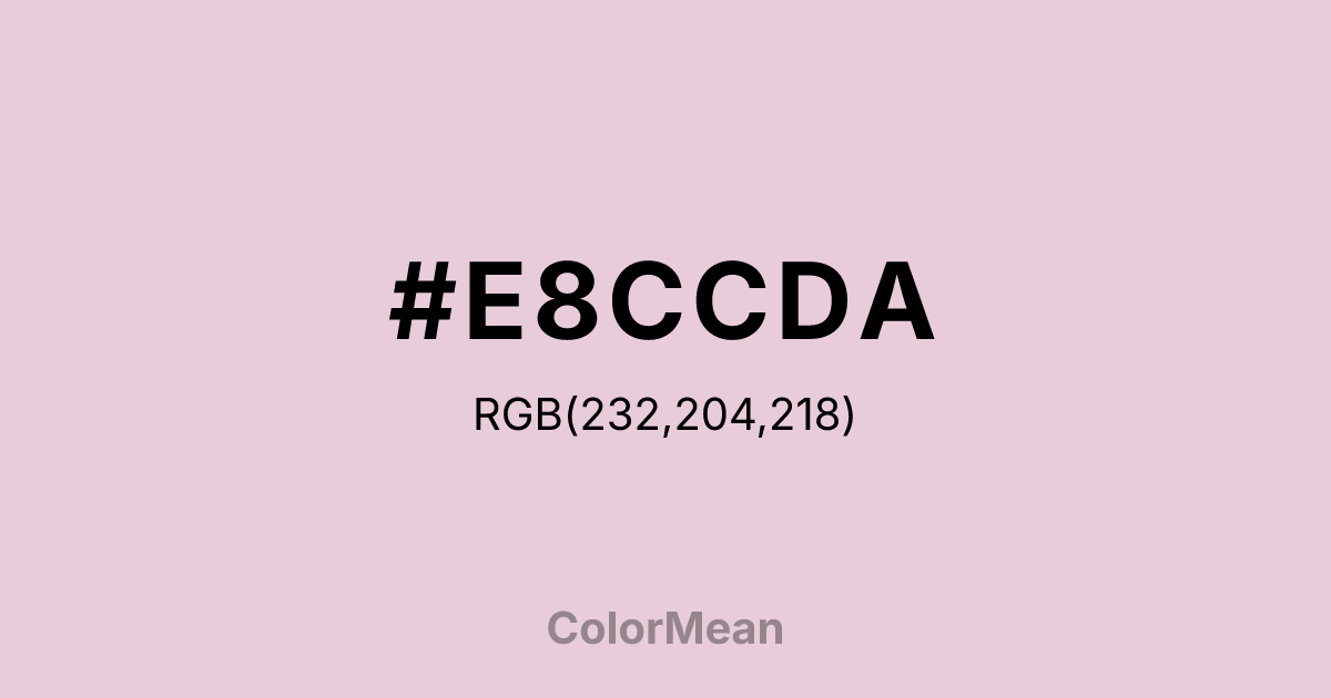#E8CCDA RGB value is (232, 204, 218). The hex color red value is 232, green is 204, and blue is 218. Its HSL format shows a hue of 330°, saturation of 38 percent, and lightness of 85 percent. The CMYK process values are 0 percent, 12 percent, 6 percent, 9 percent.