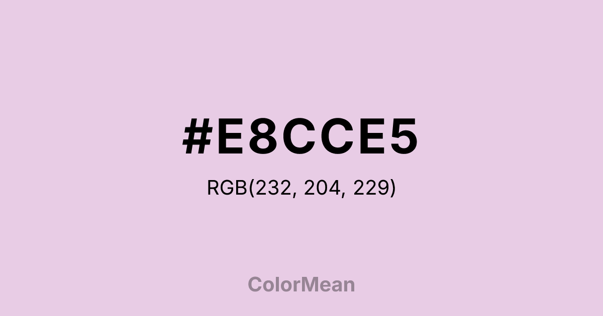 #E8CCE5 RGB value is (232, 204, 229). The hex color red value is 232, green is 204, and blue is 229. Its HSL format shows a hue of 306°, saturation of 38 percent, and lightness of 85 percent. The CMYK process values are 0 percent, 12 percent, 1 percent, 9 percent.