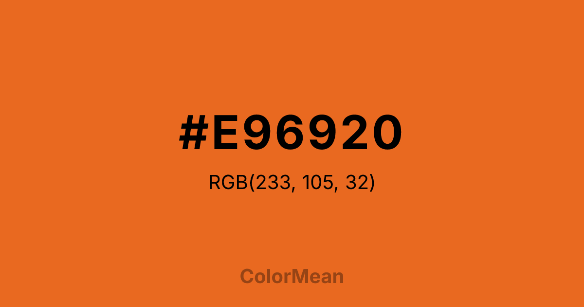 #E96920 RGB value is (233, 105, 32). The hex color red value is 233, green is 105, and blue is 32. Its HSL format shows a hue of 22°, saturation of 82 percent, and lightness of 52 percent. The CMYK process values are 0 percent, 55 percent, 86 percent, 9 percent.