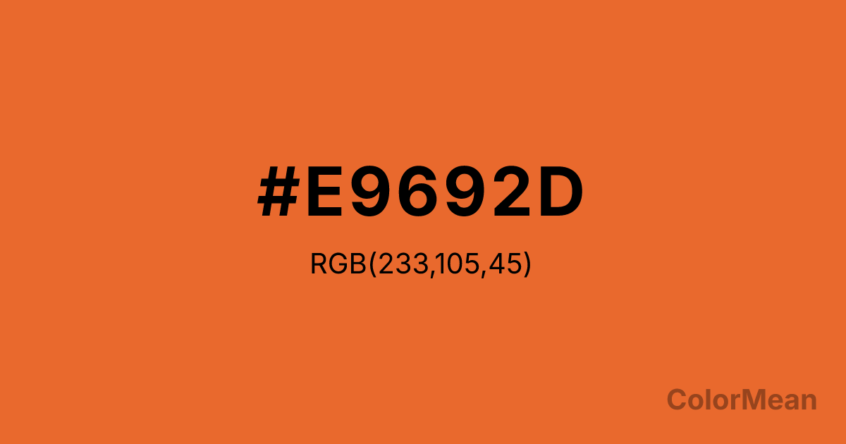 #E9692D RGB value is (233, 105, 45). The hex color red value is 233, green is 105, and blue is 45. Its HSL format shows a hue of 19°, saturation of 81 percent, and lightness of 55 percent. The CMYK process values are 0 percent, 55 percent, 81 percent, 9 percent.