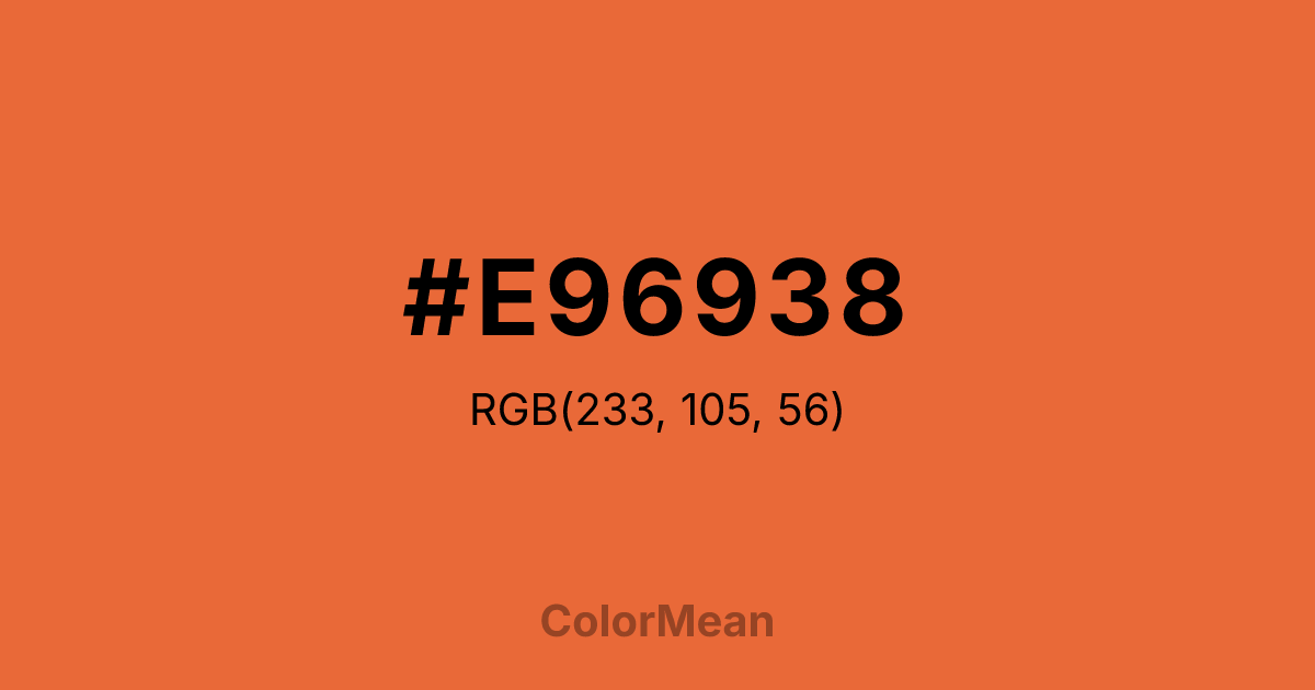 #E96938 RGB value is (233, 105, 56). The hex color red value is 233, green is 105, and blue is 56. Its HSL format shows a hue of 17°, saturation of 80 percent, and lightness of 57 percent. The CMYK process values are 0 percent, 55 percent, 76 percent, 9 percent.