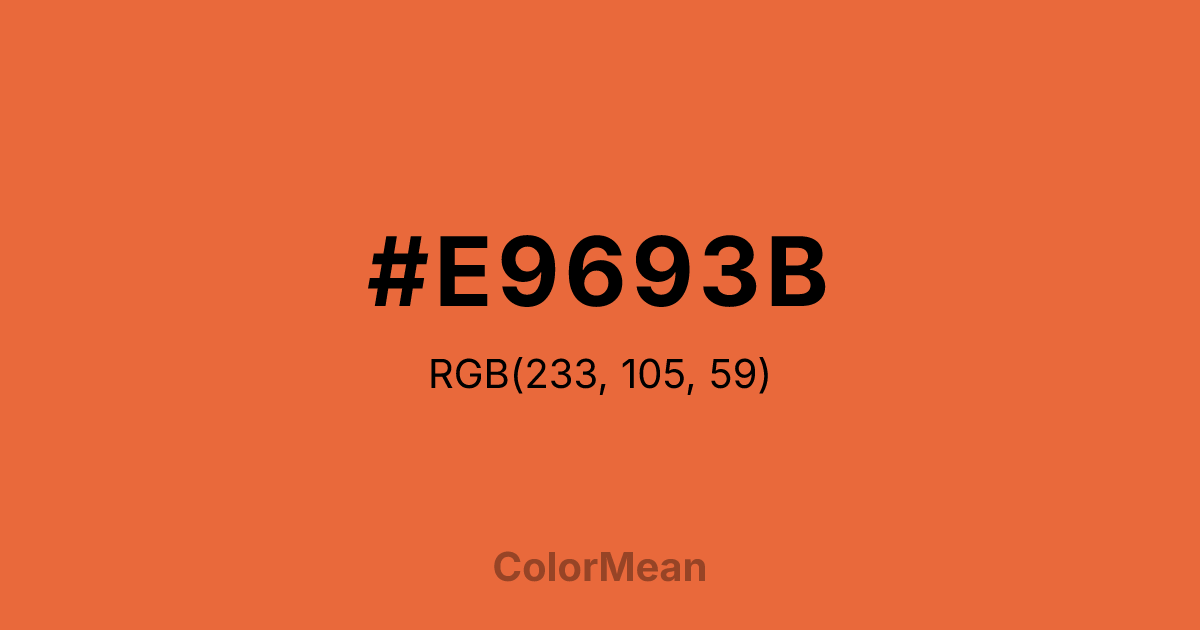 #E9693B RGB value is (233, 105, 59). The hex color red value is 233, green is 105, and blue is 59. Its HSL format shows a hue of 16°, saturation of 80 percent, and lightness of 57 percent. The CMYK process values are 0 percent, 55 percent, 75 percent, 9 percent.