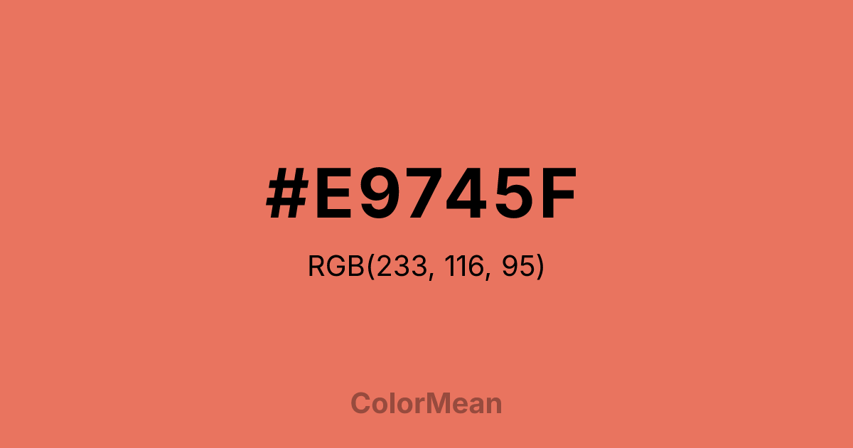 #E9745F RGB value is (233, 116, 95). The hex color red value is 233, green is 116, and blue is 95. Its HSL format shows a hue of 9°, saturation of 76 percent, and lightness of 64 percent. The CMYK process values are 0 percent, 50 percent, 59 percent, 9 percent.