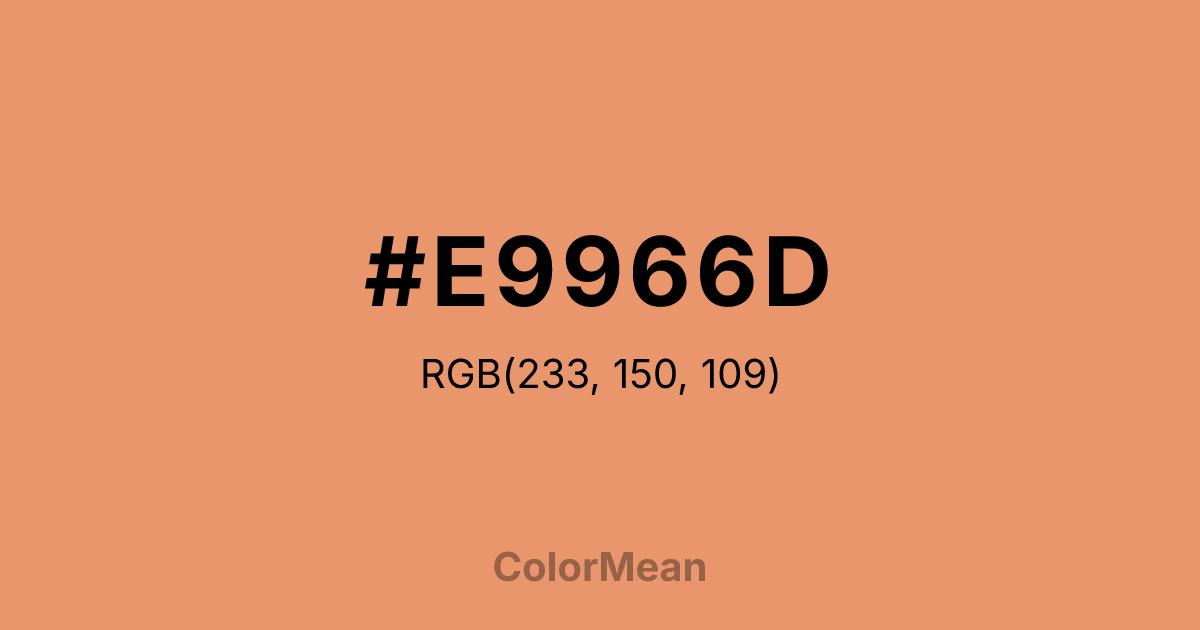 #E9966D RGB value is (233, 150, 109). The hex color red value is 233, green is 150, and blue is 109. Its HSL format shows a hue of 20°, saturation of 74 percent, and lightness of 67 percent. The CMYK process values are 0 percent, 36 percent, 53 percent, 9 percent.