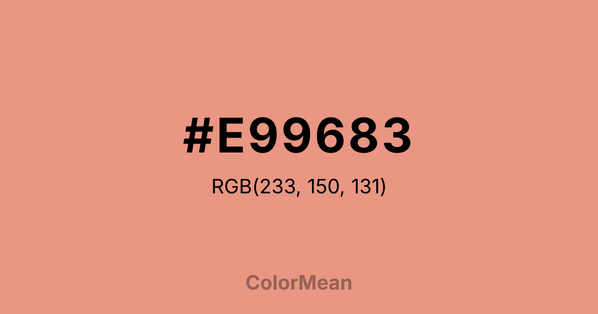 #E99683 RGB value is (233, 150, 131). The hex color red value is 233, green is 150, and blue is 131. Its HSL format shows a hue of 11°, saturation of 70 percent, and lightness of 71 percent. The CMYK process values are 0 percent, 36 percent, 44 percent, 9 percent.