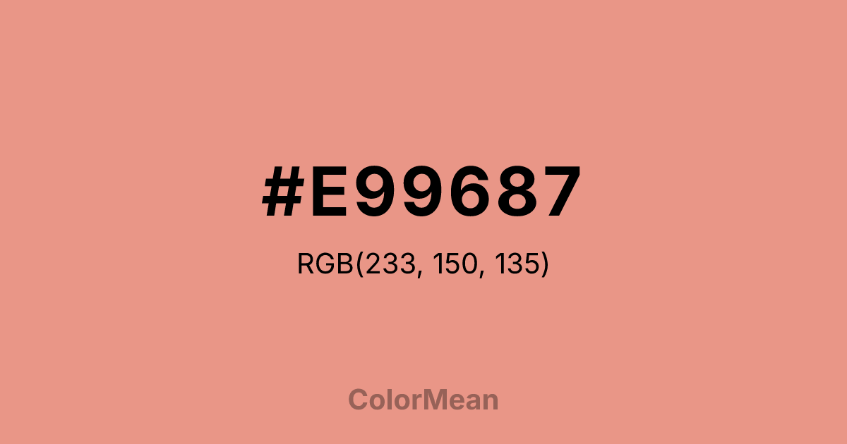 #E99687 RGB value is (233, 150, 135). The hex color red value is 233, green is 150, and blue is 135. Its HSL format shows a hue of 9°, saturation of 69 percent, and lightness of 72 percent. The CMYK process values are 0 percent, 36 percent, 42 percent, 9 percent.