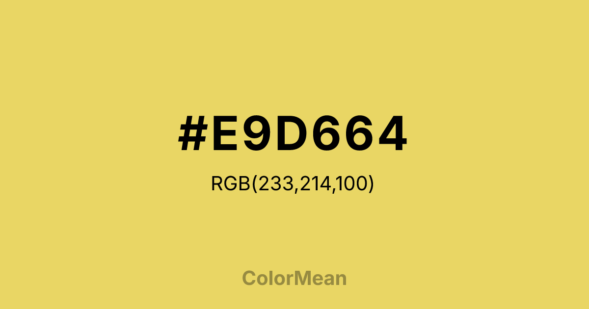 #E9D664 RGB value is (233, 214, 100). The hex color red value is 233, green is 214, and blue is 100. Its HSL format shows a hue of 51°, saturation of 75 percent, and lightness of 65 percent. The CMYK process values are 0 percent, 8 percent, 57 percent, 9 percent.