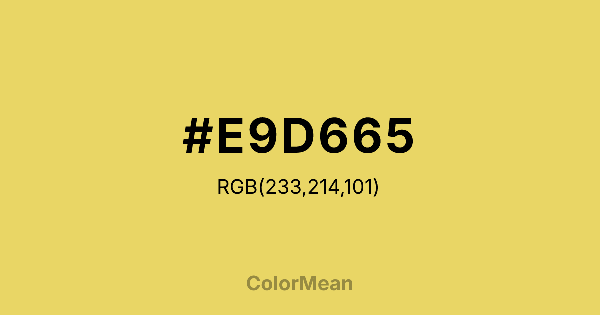 #E9D665 RGB value is (233, 214, 101). The hex color red value is 233, green is 214, and blue is 101. Its HSL format shows a hue of 51°, saturation of 75 percent, and lightness of 65 percent. The CMYK process values are 0 percent, 8 percent, 57 percent, 9 percent.