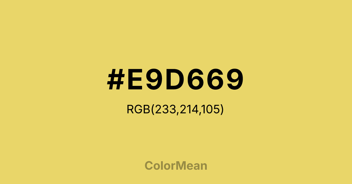 #E9D669 RGB value is (233, 214, 105). The hex color red value is 233, green is 214, and blue is 105. Its HSL format shows a hue of 51°, saturation of 74 percent, and lightness of 66 percent. The CMYK process values are 0 percent, 8 percent, 55 percent, 9 percent.