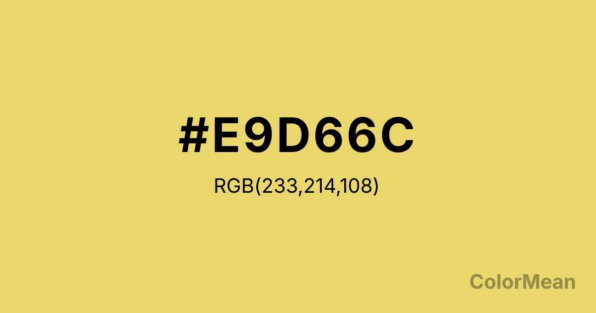 #E9D66C RGB value is (233, 214, 108). The hex color red value is 233, green is 214, and blue is 108. Its HSL format shows a hue of 51°, saturation of 74 percent, and lightness of 67 percent. The CMYK process values are 0 percent, 8 percent, 54 percent, 9 percent.