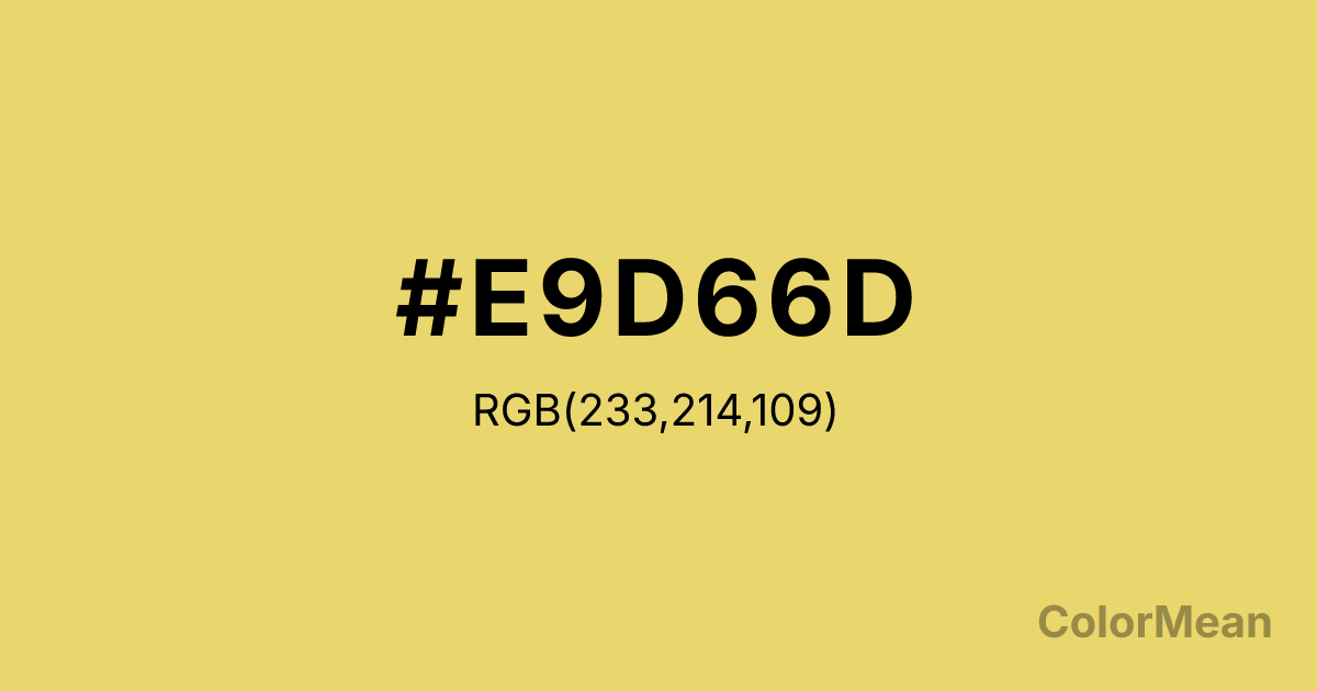 #E9D66D RGB value is (233, 214, 109). The hex color red value is 233, green is 214, and blue is 109. Its HSL format shows a hue of 51°, saturation of 74 percent, and lightness of 67 percent. The CMYK process values are 0 percent, 8 percent, 53 percent, 9 percent.
