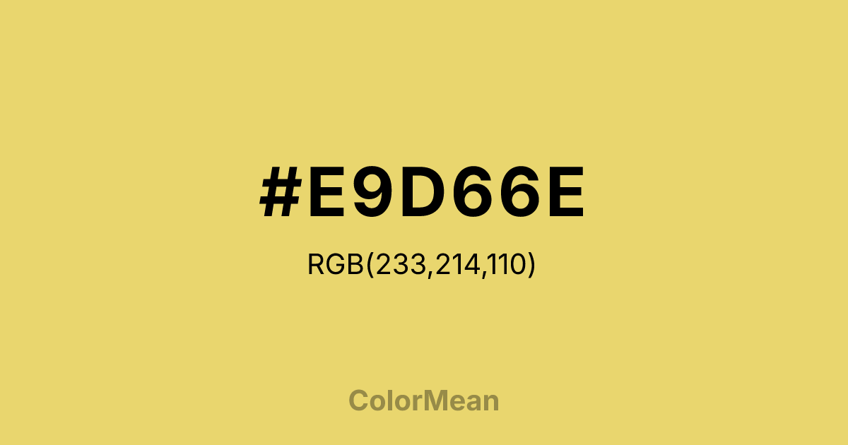 #E9D66E RGB value is (233, 214, 110). The hex color red value is 233, green is 214, and blue is 110. Its HSL format shows a hue of 51°, saturation of 74 percent, and lightness of 67 percent. The CMYK process values are 0 percent, 8 percent, 53 percent, 9 percent.