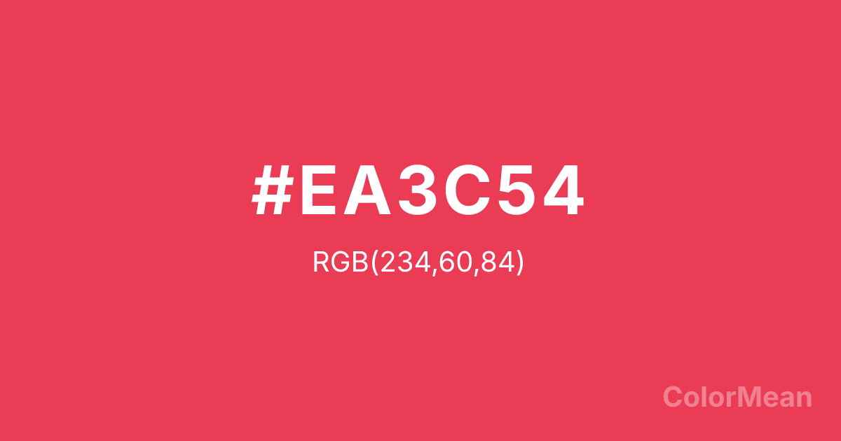 #EA3C54 RGB value is (234, 60, 84). The hex color red value is 234, green is 60, and blue is 84. Its HSL format shows a hue of 352°, saturation of 81 percent, and lightness of 58 percent. The CMYK process values are 0 percent, 74 percent, 64 percent, 8 percent.