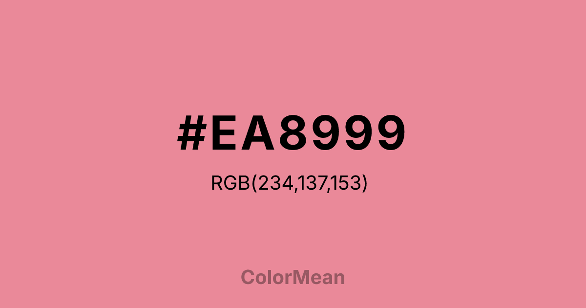 #EA8999 RGB value is (234, 137, 153). The hex color red value is 234, green is 137, and blue is 153. Its HSL format shows a hue of 350°, saturation of 70 percent, and lightness of 73 percent. The CMYK process values are 0 percent, 41 percent, 35 percent, 8 percent.