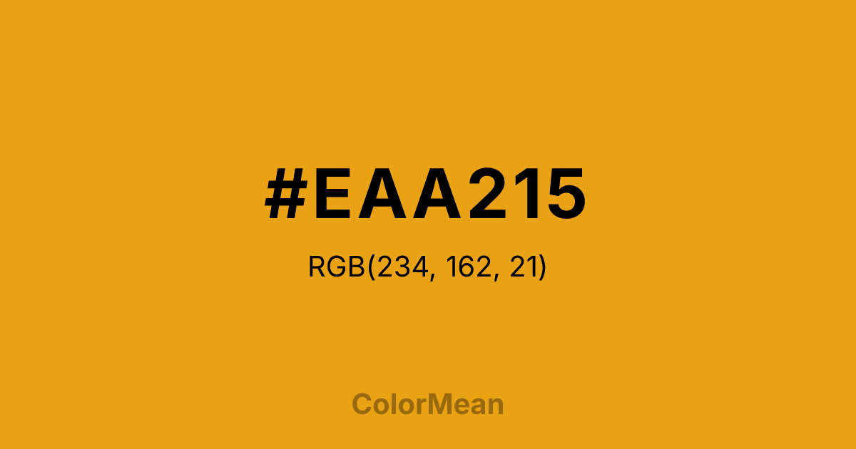 #EAA215 RGB value is (234, 162, 21). The hex color red value is 234, green is 162, and blue is 21. Its HSL format shows a hue of 40°, saturation of 84 percent, and lightness of 50 percent. The CMYK process values are 0 percent, 31 percent, 91 percent, 8 percent.