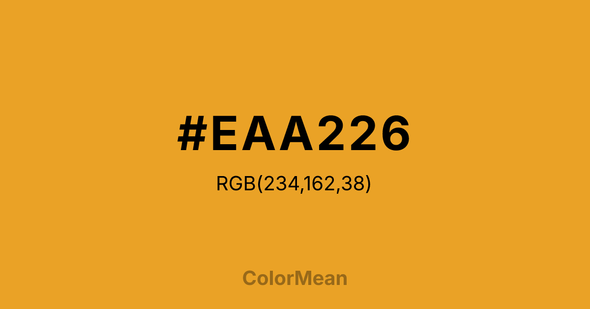 #EAA226 RGB value is (234, 162, 38). The hex color red value is 234, green is 162, and blue is 38. Its HSL format shows a hue of 38°, saturation of 82 percent, and lightness of 53 percent. The CMYK process values are 0 percent, 31 percent, 84 percent, 8 percent.