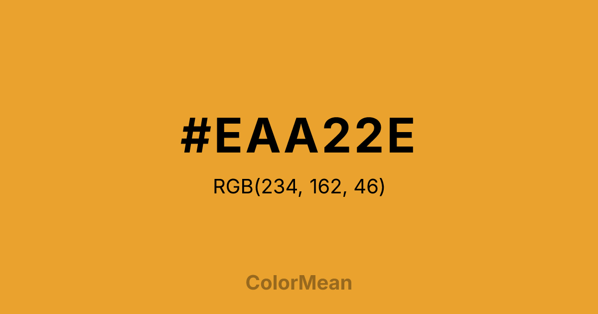 #EAA22E RGB value is (234, 162, 46). The hex color red value is 234, green is 162, and blue is 46. Its HSL format shows a hue of 37°, saturation of 82 percent, and lightness of 55 percent. The CMYK process values are 0 percent, 31 percent, 80 percent, 8 percent.