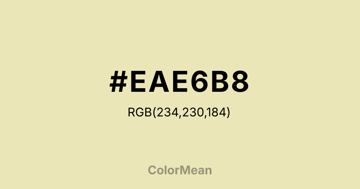 #EAE6B8 RGB value is (234, 230, 184). The hex color red value is 234, green is 230, and blue is 184. Its HSL format shows a hue of 55°, saturation of 54 percent, and lightness of 82 percent. The CMYK process values are 0 percent, 2 percent, 21 percent, 8 percent.