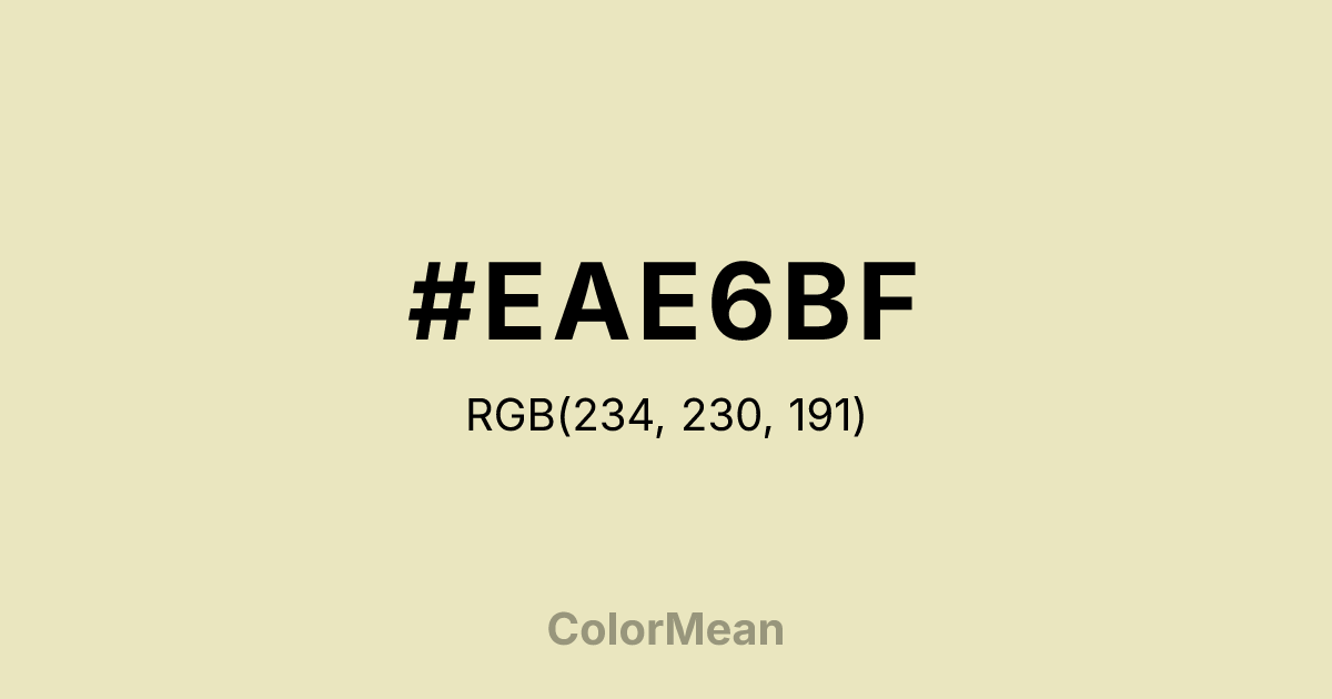#EAE6BF RGB value is (234, 230, 191). The hex color red value is 234, green is 230, and blue is 191. Its HSL format shows a hue of 54°, saturation of 51 percent, and lightness of 83 percent. The CMYK process values are 0 percent, 2 percent, 18 percent, 8 percent.