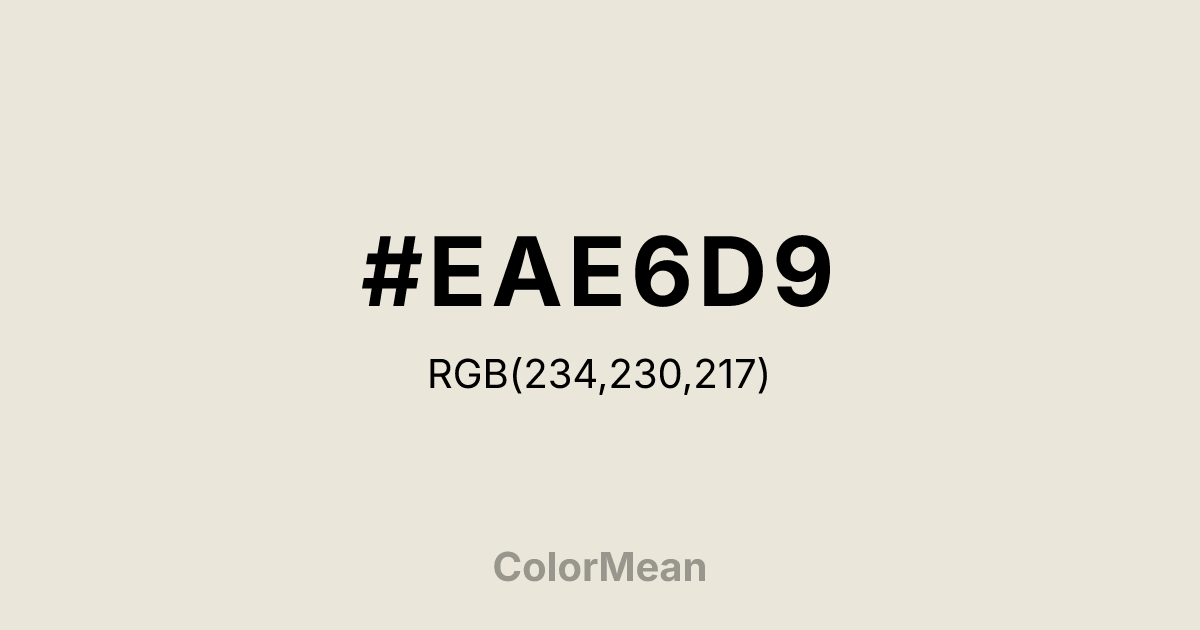 #EAE6D9 RGB value is (234, 230, 217). The hex color red value is 234, green is 230, and blue is 217. Its HSL format shows a hue of 46°, saturation of 29 percent, and lightness of 88 percent. The CMYK process values are 0 percent, 2 percent, 7 percent, 8 percent.