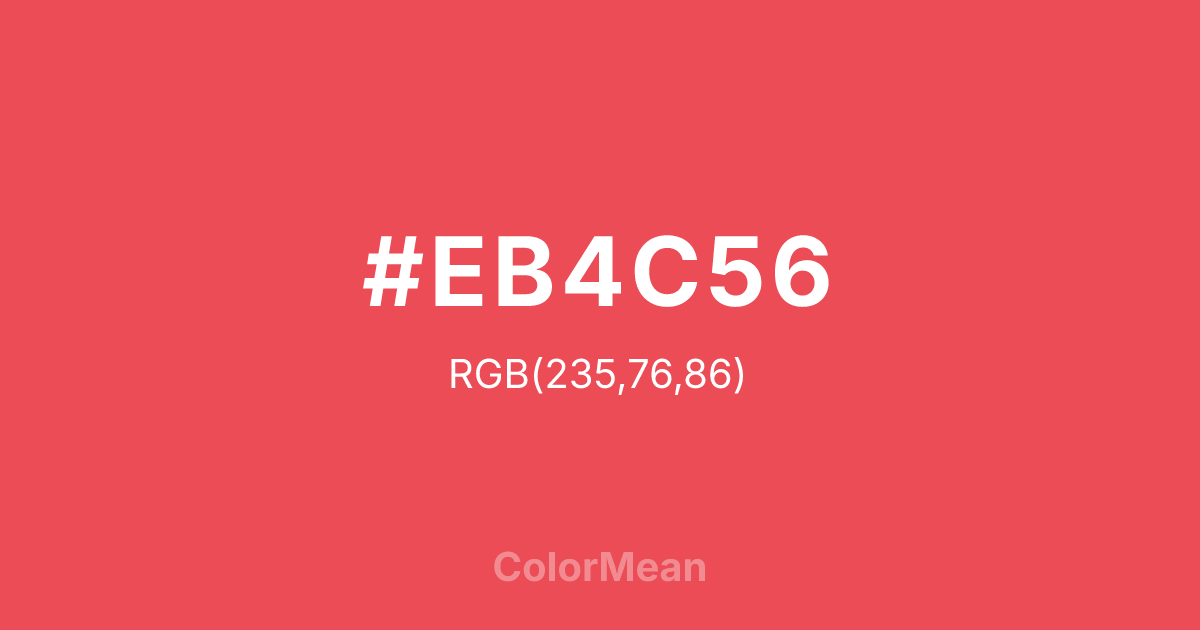 #EB4C56 RGB value is (235, 76, 86). The hex color red value is 235, green is 76, and blue is 86. Its HSL format shows a hue of 356°, saturation of 80 percent, and lightness of 61 percent. The CMYK process values are 0 percent, 68 percent, 63 percent, 8 percent.
