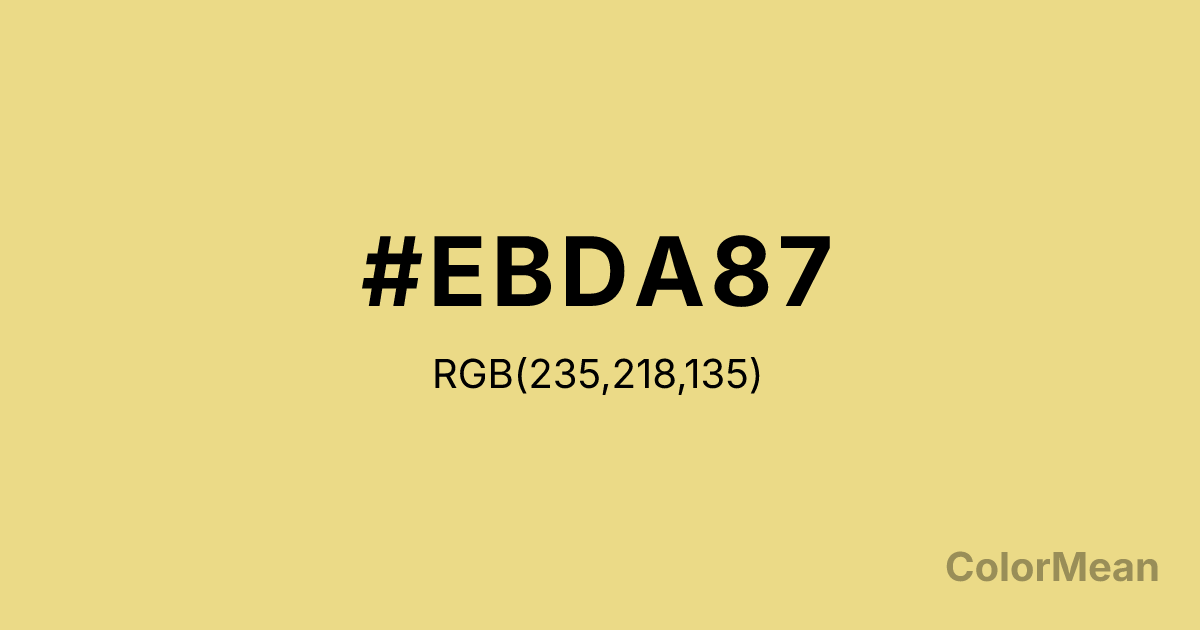 #EBDA87 RGB value is (235, 218, 135). The hex color red value is 235, green is 218, and blue is 135. Its HSL format shows a hue of 50°, saturation of 71 percent, and lightness of 73 percent. The CMYK process values are 0 percent, 7 percent, 43 percent, 8 percent.