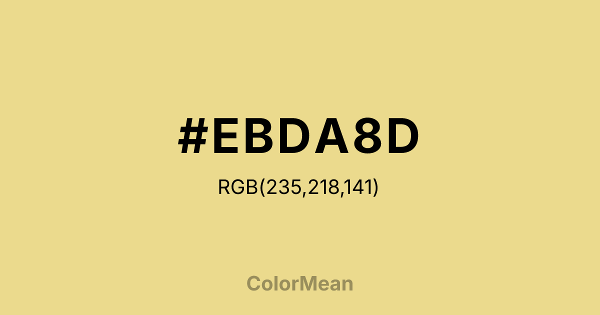 #EBDA8D RGB value is (235, 218, 141). The hex color red value is 235, green is 218, and blue is 141. Its HSL format shows a hue of 49°, saturation of 70 percent, and lightness of 74 percent. The CMYK process values are 0 percent, 7 percent, 40 percent, 8 percent.