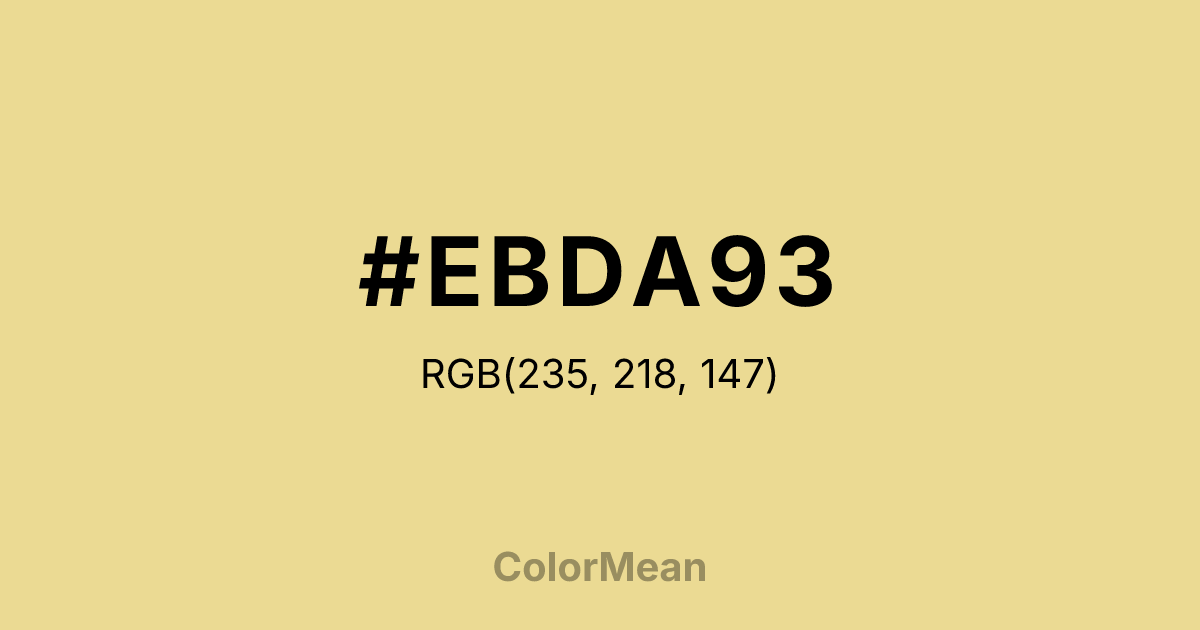 #EBDA93 RGB value is (235, 218, 147). The hex color red value is 235, green is 218, and blue is 147. Its HSL format shows a hue of 48°, saturation of 69 percent, and lightness of 75 percent. The CMYK process values are 0 percent, 7 percent, 37 percent, 8 percent.
