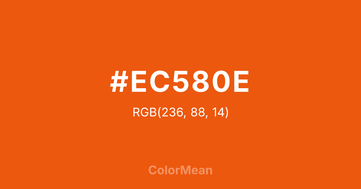 #EC580E RGB value is (236, 88, 14). The hex color red value is 236, green is 88, and blue is 14. Its HSL format shows a hue of 20°, saturation of 89 percent, and lightness of 49 percent. The CMYK process values are 0 percent, 63 percent, 94 percent, 7 percent.