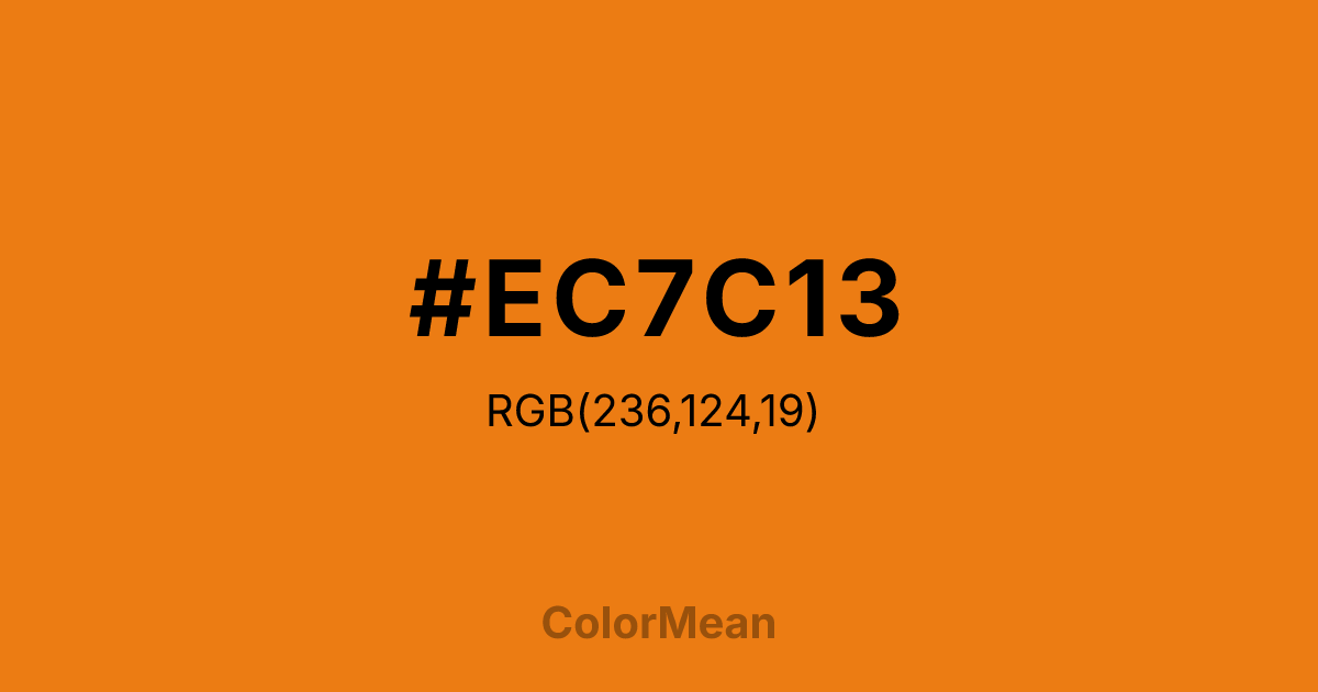 #EC7C13 RGB value is (236, 124, 19). The hex color red value is 236, green is 124, and blue is 19. Its HSL format shows a hue of 29°, saturation of 85 percent, and lightness of 50 percent. The CMYK process values are 0 percent, 47 percent, 92 percent, 7 percent.