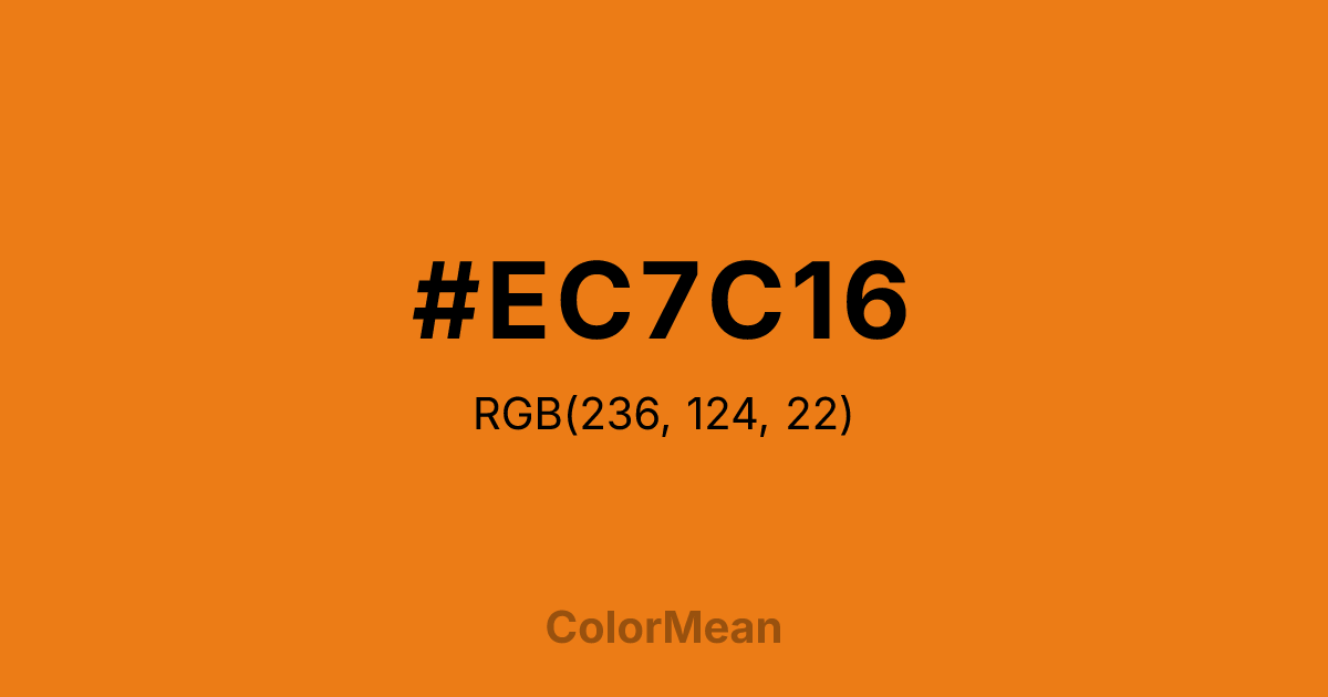 #EC7C16 RGB value is (236, 124, 22). The hex color red value is 236, green is 124, and blue is 22. Its HSL format shows a hue of 29°, saturation of 85 percent, and lightness of 51 percent. The CMYK process values are 0 percent, 47 percent, 91 percent, 7 percent.