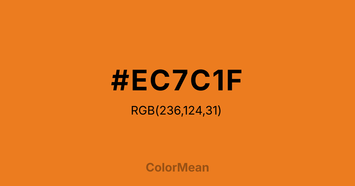 #EC7C1F RGB value is (236, 124, 31). The hex color red value is 236, green is 124, and blue is 31. Its HSL format shows a hue of 27°, saturation of 84 percent, and lightness of 52 percent. The CMYK process values are 0 percent, 47 percent, 87 percent, 7 percent.