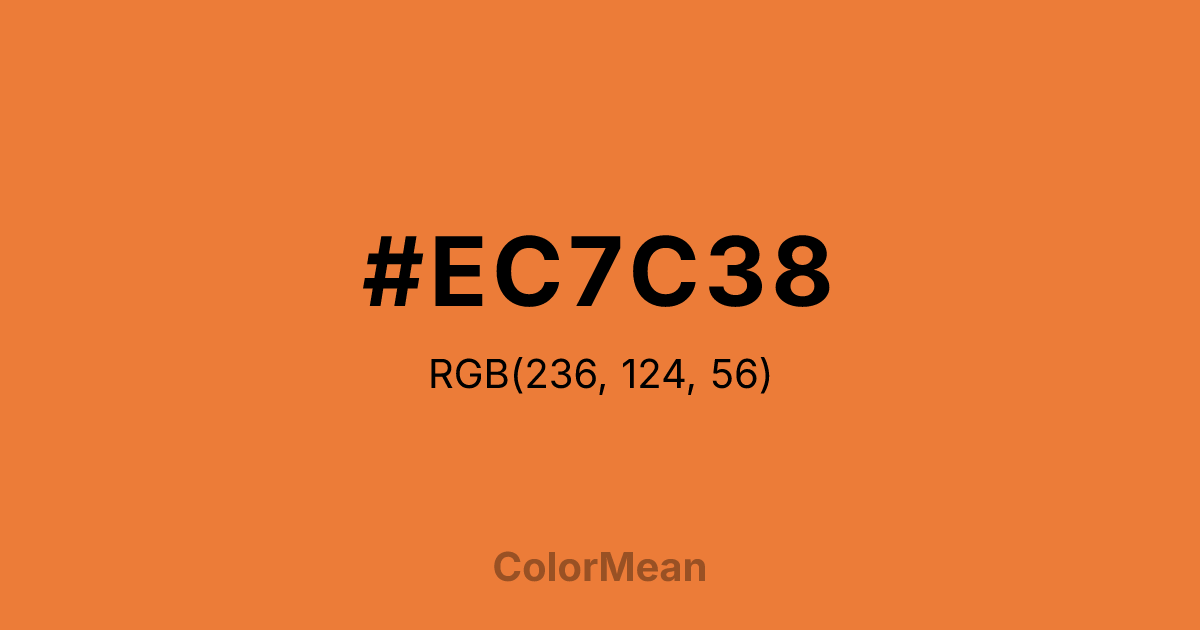 #EC7C38 RGB value is (236, 124, 56). The hex color red value is 236, green is 124, and blue is 56. Its HSL format shows a hue of 23°, saturation of 83 percent, and lightness of 57 percent. The CMYK process values are 0 percent, 47 percent, 76 percent, 7 percent.