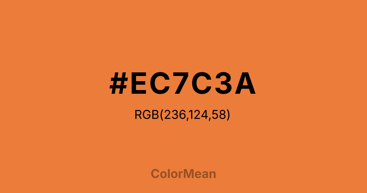 #EC7C3A RGB value is (236, 124, 58). The hex color red value is 236, green is 124, and blue is 58. Its HSL format shows a hue of 22°, saturation of 82 percent, and lightness of 58 percent. The CMYK process values are 0 percent, 47 percent, 75 percent, 7 percent.