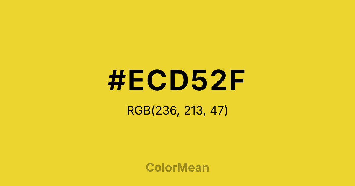 #ECD52F RGB value is (236, 213, 47). The hex color red value is 236, green is 213, and blue is 47. Its HSL format shows a hue of 53°, saturation of 83 percent, and lightness of 55 percent. The CMYK process values are 0 percent, 10 percent, 80 percent, 7 percent.