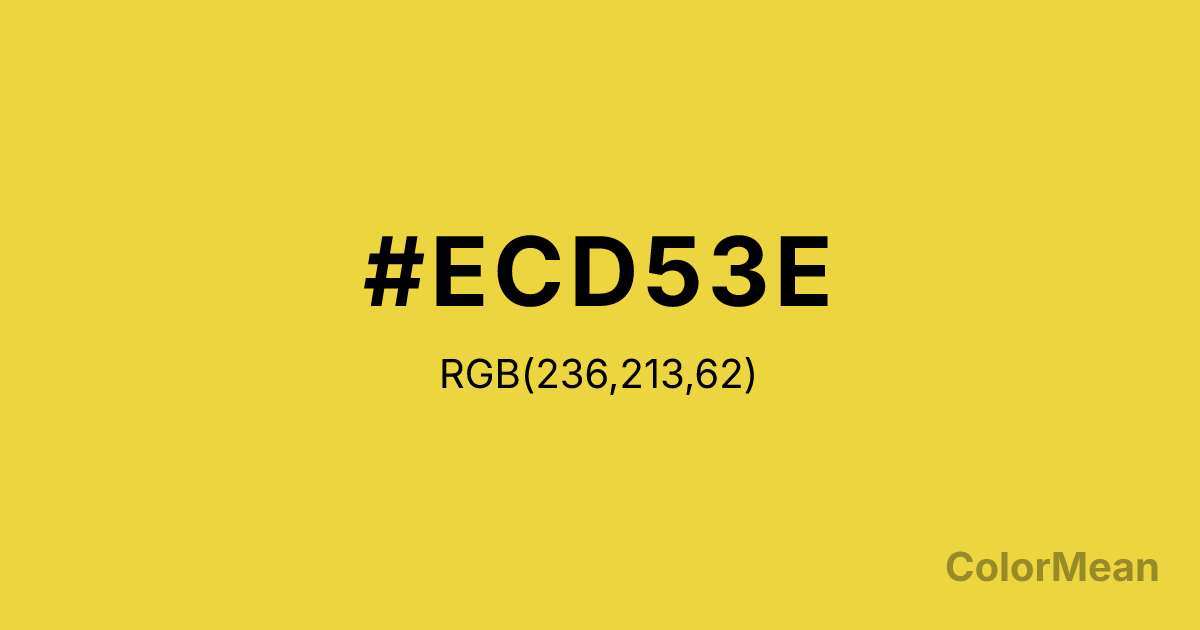 #ECD53E RGB value is (236, 213, 62). The hex color red value is 236, green is 213, and blue is 62. Its HSL format shows a hue of 52°, saturation of 82 percent, and lightness of 58 percent. The CMYK process values are 0 percent, 10 percent, 74 percent, 7 percent.