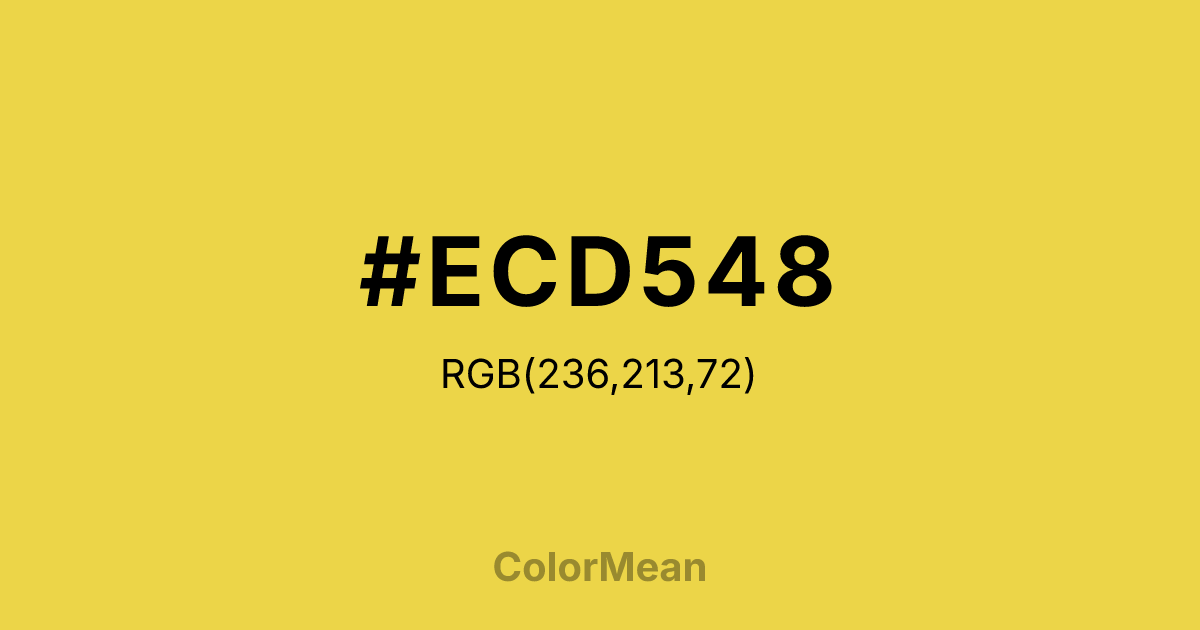 #ECD548 RGB value is (236, 213, 72). The hex color red value is 236, green is 213, and blue is 72. Its HSL format shows a hue of 52°, saturation of 81 percent, and lightness of 60 percent. The CMYK process values are 0 percent, 10 percent, 69 percent, 7 percent.