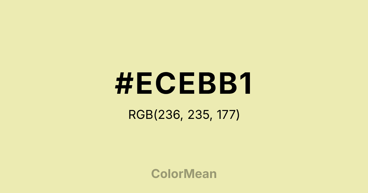 #ECEBB1 RGB value is (236, 235, 177). The hex color red value is 236, green is 235, and blue is 177. Its HSL format shows a hue of 59°, saturation of 61 percent, and lightness of 81 percent. The CMYK process values are 0 percent, 0 percent, 25 percent, 7 percent.